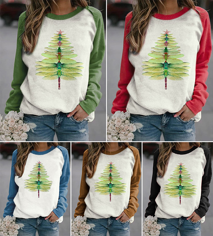 The sweatshirt features Dragonfly Christmas Tree Print. Funny Christmas tree graphic, regular loose sweatshirt, long sleeve, round neck, fashion and simple. Unique and cute Christmas design perfect for your Christmas holiday wearing! Cute Christmas tree graphic makes you funny, wear it and enjoy a colorful holiday.
